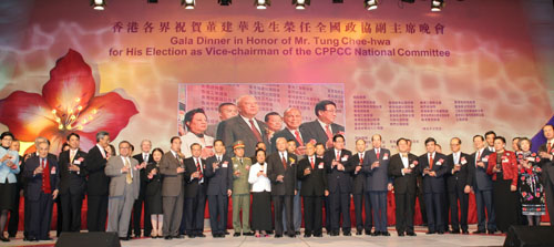 近五百個大小機(jī)構(gòu),今晚在香港會議展覽中心合辦“香港各界祝賀董建華先生榮任全國政協(xié)副主席晚會”,祝賀董建華出任全國政協(xié)副主席,并感謝其對香港社會發(fā)展之貢獻(xiàn)。