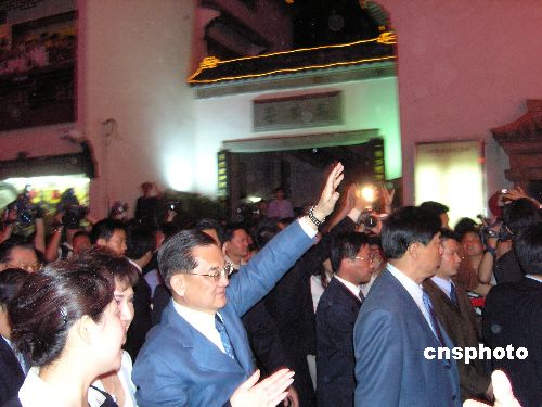 4月27日,中國國民黨主席連戰(zhàn)夫婦在夫子廟狀元樓酒店品嘗泰淮小吃晚宴后,攜夫人連方瑀女士輕松夜游秦淮河。晚8時(shí)許,連戰(zhàn)主席餐后步行走出狀元樓酒店,在夫子廟流連的燈光中,沿街兩旁的市民擊掌慶賀,連戰(zhàn)微笑著向行人致意。整個(gè)游覽過程大約在半小時(shí)左右。作者:水從澤