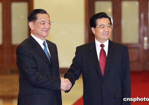 中共中央總書記胡錦濤在北京人民大會(huì)堂與中國(guó)國(guó)民黨主席連戰(zhàn)會(huì)面,實(shí)現(xiàn)了兩黨最高領(lǐng)導(dǎo)人相隔60年后的歷史性握手。