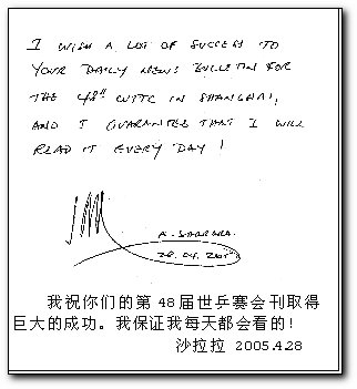 “兩周前當(dāng)我來(lái)到上海,我所看到的一切告訴我,上海為這屆世乒賽作了充分的準(zhǔn)備。三天前我再次走下飛機(jī),一路上到處是彩旗、海報(bào)、宣傳廣告,我看到了布置一新的主、副場(chǎng)館,感受到親切的接待服務(wù)。我還聽(tīng)說(shuō)人們熱情高漲,幾乎所有的球票都賣(mài)完了。這使我更加確信,上海已經(jīng)完全準(zhǔn)備好了!眹(guó)際乒聯(lián)主席沙拉拉昨天在接受本報(bào)記者專訪時(shí),再一次對(duì)上海的世乒賽組織工作豎起大拇指。