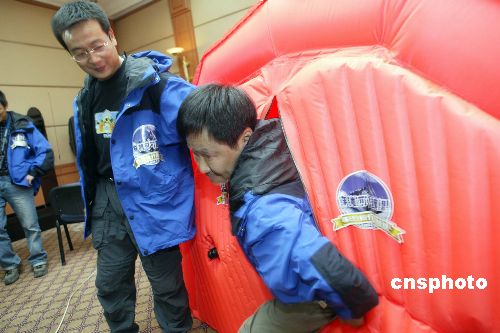 四月二十一日,由北京三夫戶外運動俱樂部發(fā)起并成立、聯(lián)想集團(tuán)公司冠名贊助的一支民間科學(xué)考察隊伍-聯(lián)想鋒行科學(xué)考察探險隊在北京正式成立,將于今年五月份對可可西里(藏北、新疆阿爾金山區(qū)域)進(jìn)行由南至北的穿越式科學(xué)考察活動,最重要的科考內(nèi)容是與北京大學(xué)環(huán)境學(xué)院聯(lián)合進(jìn)行的“青藏高原可可西里地區(qū)表土POPs分布調(diào)查”項目,這項科考內(nèi)容在中國還是第一次。本次科考探險活動將從五月一日開始,歷時二十二天,行程六千多公里,其中穿越無人區(qū)達(dá)一千六百多公里。圖為科考探險隊隊員演示一個酷似帳篷的便攜式高壓氧艙。作者:盛佳鵬