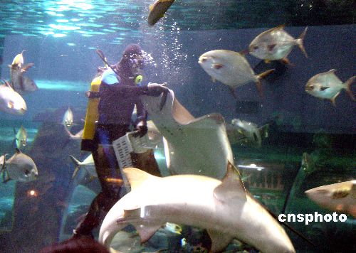 2005年5月6日,秦皇島新澳海底世界成為今年秦皇島“五一”黃金周海洋旅游線路的一處亮點(diǎn),每天下午的喂鯊魚表演,吸引了來自東北、唐山、天津、北京等地游客的目光。作者:李佳明