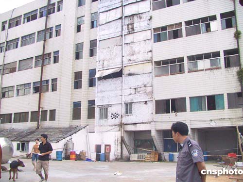 經(jīng)公安人員同意,記者獲準在工廠院門前拍照。剛端起相機,一條棕褐色大狼狗沖著記者大吠。而在另一幢樓門前,另一條狼狗正虎視耽耽盯著記者。這兩條大狼狗并沒有繩索牽絆,行動自如。一位紅腫著雙眼的女孩聞聲走到門前,欲關門拒絕記者拍照。