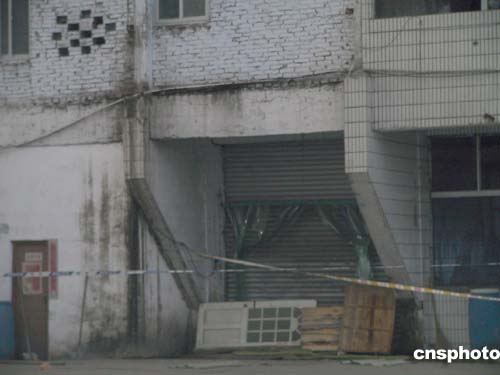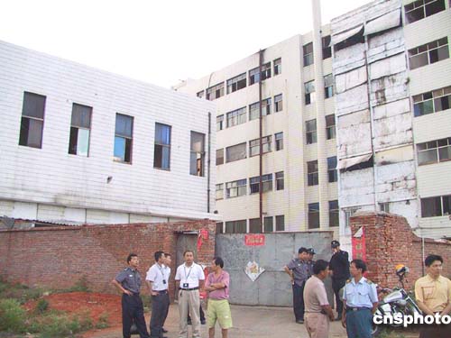工廠由兩幢半拉子樓組成,樓房顯得很陳舊,一些窗戶甚至沒有玻璃,黑洞洞地呲著嘴。正對院門的大樓據(jù)說是生產車間,高六層。大樓中間是電梯井房,但沒有安裝電梯。廢棄的電梯井房便被工廠當作生產浸泡水池。一樓電梯井口的鐵制卷閘門被嚴密地拉下,前面還擋了一塊門板和一條警戒線。