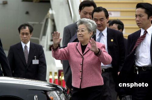 中國(guó)國(guó)務(wù)院副總理吳儀五月二十二日下午抵達(dá)東京羽田機(jī)場(chǎng),繼續(xù)她的日本之行。圖為吳儀在機(jī)場(chǎng)向前來歡迎的當(dāng)?shù)厝A僑和留學(xué)生代表招手致意。作者:王健