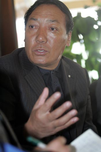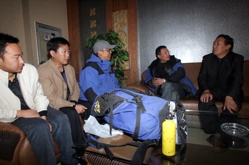 穿越可可西里聯(lián)想鋒行探險(xiǎn)隊(duì)向可可西里國家級(jí)自然保護(hù)區(qū)管理局捐贈(zèng)兩臺(tái)聯(lián)想電腦。圖為可可西里國家級(jí)自然保護(hù)區(qū)管理局局長才嘎在西寧小天鵝賓館探望此間下榻的探險(xiǎn)隊(duì)員。