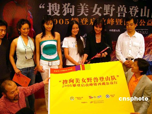 5月23日,搜狐總裁張朝陽(yáng)(前排右一)在北京宣布,一支由世界小姐冠軍、兩岸三地影視明星以及精英企業(yè)家組成“2005搜狗美女野獸登山隊(duì)”,將于今年7月攀登海拔6026米的西藏啟孜峰。由搜狐公司組織發(fā)起的這次登山活動(dòng),是一項(xiàng)以挑戰(zhàn)自我極限、關(guān)注西藏的環(huán)保、文化和教育的公益活動(dòng)。作者:潘旭臨