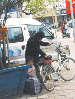 一邊等待,這個(gè)“乞兒”一邊將自己的要錢罐、滑輪車放進(jìn)了一個(gè)編織袋內(nèi)。沒了滑輪車,他怎么走?就在記者疑惑時(shí),中午給“乞兒”送肉包子的那個(gè)男子騎著一輛自行車來了。看到“乞兒”遞上的大把錢幣,他滿意地向“乞兒”點(diǎn)點(diǎn)頭,然后將“乞兒”抱上自行車后貨架,離開了。