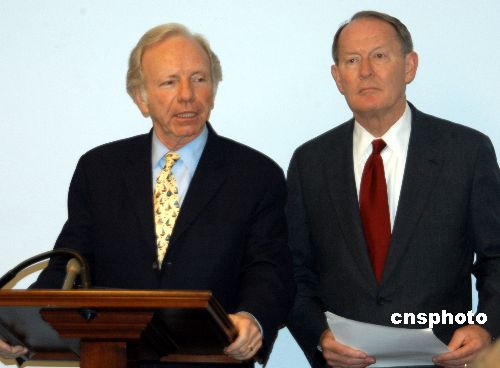 曾在去年競選總統(tǒng)的美國參議員利伯曼(左)與另一名參議員亞歷山大(右),25日聯(lián)合提出旨在促進美中交流的“美中文化接觸法案”議案。他呼吁在國際事務中視中國為盟友,在商業(yè)活動中待中國為伙伴,加強與中國的接觸和交流,美國才會擁有燦爛的未來。作者:余東暉