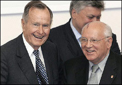 現(xiàn)任美國總統(tǒng)布什的父親老布什星期一與戈爾巴喬夫在莫斯科共同會見學(xué)生和記者時說:“我今天已正式邀請戈爾巴喬夫參加我的下一次跳傘活動。”老布什總統(tǒng)稱,戈爾巴喬夫?qū)Υ说姆磻?yīng)是“不,不,不”。