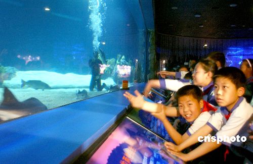 五月二十六日,北京“環(huán)保小衛(wèi)士”在中華鱘館觀看科研人員在水下對中華鱘投喂鯽魚。作者:韓藝冰