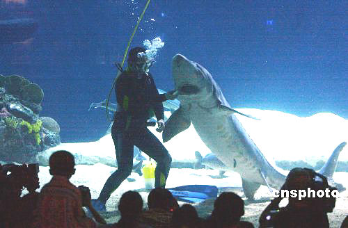 五月二十六日,觀察科研人員在水下對中華鱘投喂鯽魚。從第一尾國寶級中華鱘進入北京海洋館至今,二十六尾中華鱘已經(jīng)完全適應(yīng)人工喂養(yǎng)。作者:韓藝冰