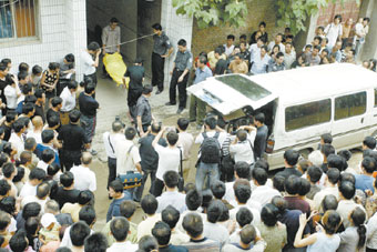13時10分,記者從遠處看到,那名劫持人質(zhì)的男子從2樓的窗戶里探出頭張望。13時14分,一個身穿灰黑色短袖、土黃色中褲的身影從居民樓2樓距地面約4.5米的窗口凌空落下,落地時伴隨著一聲凄厲的女聲尖叫。人群“嘩”地往上擁,附近的3名男子馬上上前抬起落地女子,欲送往等候多時的120急救車上。幾乎就在同時,突然從民房內(nèi)傳出4聲沉悶的槍響,一直在一旁等待的人質(zhì)父母雙雙昏厥。周圍的群眾有人大喊,有人鼓掌,大家都猜測到劫匪已經(jīng)死了。在場所有媒體的記者也試圖拍攝下女子被送進救護車的鏡頭,但遭到公安人員與部分村民的強行制止。
