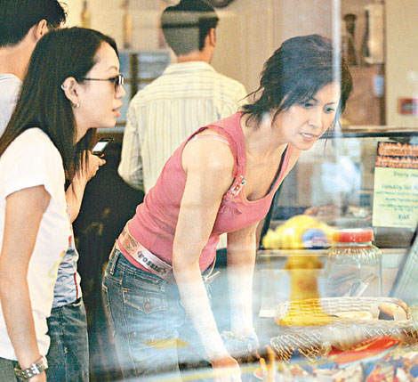 之后一行人到了附近的餐廳喝下午茶,身穿背心的Maggie彎腰在凍柜揀蛋糕時,露出豐胸后的美好身段,一坐下已急不及待展示剛剛選購的泳衣,并在自己身上比量,又不斷問友人漂不漂亮,臉上充滿自信。只見她胃口不錯,短短時間已吃下不少東西。