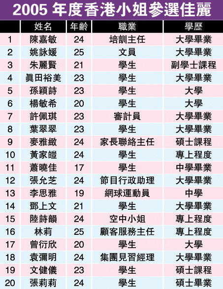 中新網6月7日電 據香港媒體報道,《2005年度香港小姐競選》二十位候選佳麗將于下周一起程到南亞海嘯災區(qū)探訪,昨日一班佳麗經過大會連日來“改頭換面”,首次正式會見傳媒。今屆參選的佳麗學歷俱十分高,大部分佳麗皆擁有大學程度,其中9號麥雅致、19號文健儀和20號張莉莉更持有碩士學位。不過佳麗們的平均年齡亦直線上升,有九位佳麗年齡更在24歲以上,接近參選的年齡上限。