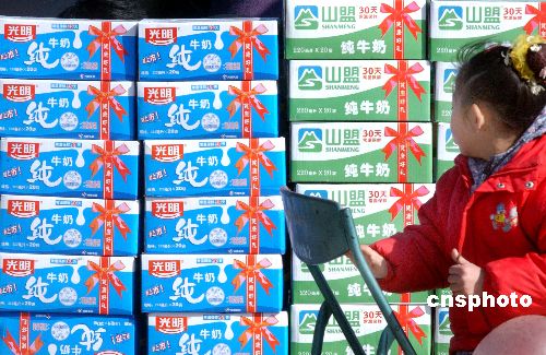 河南媒體近日報道了鄭州光明山盟乳業(yè)有限公司“變質光明牛奶返廠加工再銷售”一事。對此,鄭州光明山盟的控股方——光明乳業(yè)股份有限公司當日發(fā)布了“誠告消費者書”,稱“鄭州光明山盟從來沒有做過‘將變質牛奶返廠加工再銷售’的行為”,但也坦承光明在管理上存在疏漏。圖為2005年3月13日鄭州街頭促銷的光明純牛奶和光明山盟純牛奶。作者:馬健