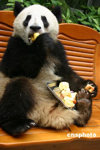 端午節(jié)將臨,6月10日上午,成都大熊貓繁育研究基地工作人員為大熊貓準(zhǔn)備了特殊的節(jié)日禮物:削成粽子形狀的蘋果。兩歲的大熊貓“成仔”正在盡情享用這份節(jié)日大餐。作者:楊杰
