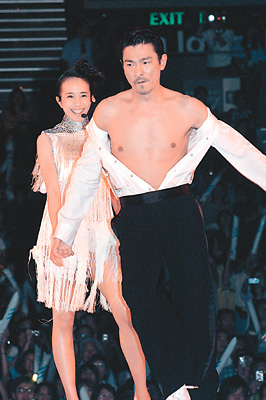 早前彩排時(shí),Karen已透露會(huì)跟靚仔嘉賓劉德華大跳辣身舞,當(dāng)晚雖然男友馮德倫出現(xiàn)監(jiān)場(chǎng),惟不影響Karen的豪放表演。與“華仔”跳辣身舞時(shí),動(dòng)作大膽,只見“華仔”自Karen的玉背一直摸到她的屁股位置,看得觀眾嘩聲四起;跟著她更投向“華仔”的懷抱,將長腿鉗住對(duì)方,繼而慢慢將“華仔”的衣衫逐件脫下來。與此同時(shí),“華仔”亦不甘示弱,把Karen的外衣脫去,剩下一條貼身低胸的白色連身裙;Karen亦一手把“華仔”的恤衫扯開,令“華仔”兩點(diǎn)盡露,全場(chǎng)觀眾尖呼狂叫。被脫光上衣的“華仔”即轉(zhuǎn)返后臺(tái),而兩位男舞蹈員出場(chǎng),繼續(xù)把Karen的長裙除去,最后只剩下白色bratop和短褲,非常誘惑。