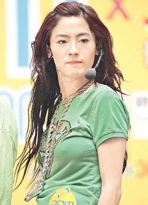 昨天柏芝穿上綠色T恤襯低腰褲作hip hop打扮,跳舞時卻配上“特別效果”,胸前出現(xiàn)“凸點”現(xiàn)象之余,黑色內(nèi)褲邊也隨著拍子頻頻曝光。柏芝更是語出驚人,在與fans跳舞時,她竟向fans說:“你用下面(下半身)頂住記者就得。”十分不文。當(dāng)她唱《新聞女王》時,有人假扮狗仔隊偷拍她,柏芝就用屁股把他頂開。