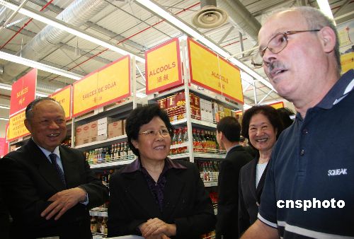 | 中國(guó)國(guó)務(wù)院僑辦主任陳玉杰(左二)一行當(dāng)?shù)貢r(shí)間六月十一日來(lái)到法國(guó)華人最大的企業(yè)之一陳氏兄弟公司總部參觀,同陳氏集團(tuán)董事長(zhǎng)陳克威(左一)進(jìn)行了會(huì)談。圖為陳玉杰與購(gòu)物的法國(guó)顧客交談。作者:鐘誠(chéng)