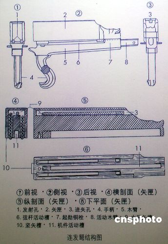 弩機(jī)示意圖。弩機(jī)是具有遠(yuǎn)射和殺傷力較強(qiáng)的武器,它的構(gòu)造分矢匣和機(jī)體兩部分。機(jī)件為銅質(zhì),矢匣用楠木雕制,呈長(zhǎng)方形,前端下緣有兩個(gè)并列的半圓形發(fā)射孔。匣內(nèi)有三個(gè)儲(chǔ)存矢的槽,兩側(cè)為豎槽,可儲(chǔ)矢九枝,中間為水平槽,可并列放置二內(nèi)。?