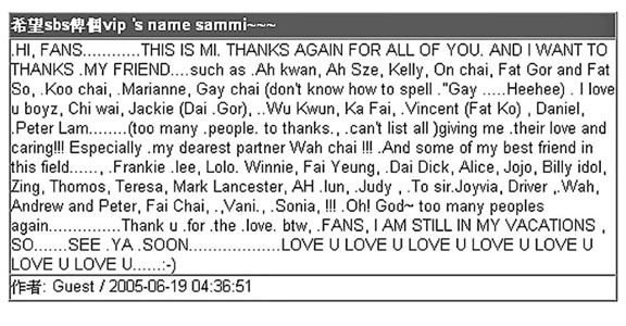 其實自Sammi接拍《長恨歌》以來,關(guān)于其身體及精神狀況的傳聞一直沒完沒了,曾志偉早前透露梅艷芳的逝世對她打擊很大,更有意退出娛樂圈。不過,Sammi為安撫歌迷,曾化名“Mi”以英文在網(wǎng)上留言,表示自己身體很好。剛過去的星期天,她更兩度在網(wǎng)上留言,除了祝愿天下父親“父親節(jié)快樂”外,更于凌晨時分留言答謝一眾好友,當(dāng)中包括安仔、古天樂、古巨基、陳慧琳及劉德華等,可見Sammi與安仔關(guān)系依然要好。