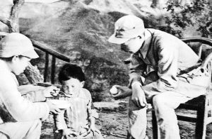 在一陣炮火之后,我與連長韓金銘、四班長和衛(wèi)生員小李沖進(jìn)山下的碉堡。這時里面還冒著硝煙,我們看到幾具日軍的尸體橫在地上,其中一具是日本婦女。使大家驚奇的是,在她的身邊有一個大約5歲左右的小姑娘木然地站在那里,用恐懼的目光呆呆地望著我們。大家斷定,這是敵人的家屬,是個無辜的孩子。這時車站的敵人還一個勁兒地向碉堡射擊。連長馬上命令我:“快把這小孩護(hù)送到營部的救護(hù)所去!”我抱起小姑娘,迅速地撤離了碉堡,沿交通壕往回返。