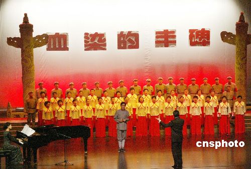 | 六月二十六日,為紀念中國工農(nóng)紅軍長征勝利七十周年和中國人民抗日戰(zhàn)爭勝利六十周年,曾參加過戰(zhàn)爭的老紅軍、新四軍、八路軍匯聚在北京解放軍歌劇院,參加在這里舉行的“血染的豐碑”紀念活動。圖為北京新四軍研究會藝術(shù)團、寶塔山合唱團以及哈爾濱軍工校友合唱團在活動上演唱歷史歌曲。作者:錢興強