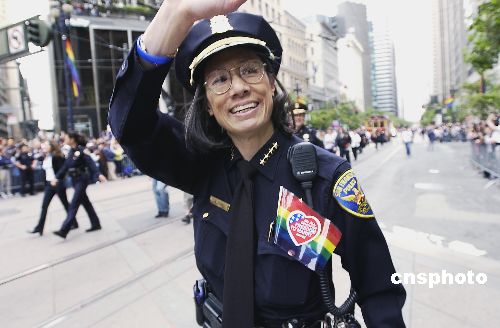 美國舊金山六月二十六日舉行第三十五屆同性戀大游行時,舊金山市華裔警察局長方宇文女士興致勃勃走在大街上維護(hù)秩序。作者:陳鋼