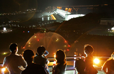 從明天起,斬?cái)嚅L(zhǎng)江的三峽大壩,每天將允許1000名普通游客把這個(gè)龐然大物“踩”在腳下!7月1日,三峽大壩壩頂將首次對(duì)游客開(kāi)放,但今年的開(kāi)放時(shí)間因施工需要到9月30日截止,到明年汛期再行開(kāi)放。本報(bào)記者于昨日趕到壩區(qū)并星夜上壩,打探到壩頂旅游臺(tái)前幕后諸多細(xì)節(jié)。