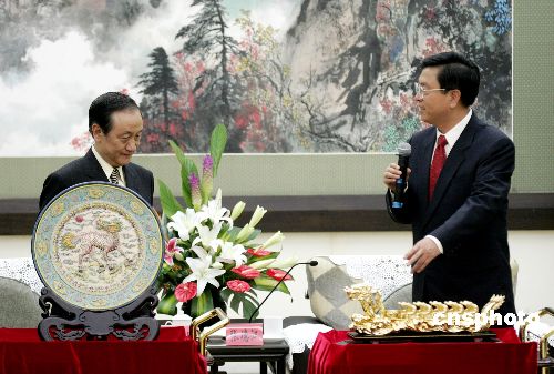 會(huì)見結(jié)束時(shí),張德江向新黨大陸訪問團(tuán)贈(zèng)送了金漆木雕“龍舟”,寓意戮力同心、戰(zhàn)勝困難。新黨大陸訪問團(tuán)贈(zèng)送給廣東一件交趾燒“麒麟盤”,取麒麟對(duì)抗邪惡之意,據(jù)說這種陶器制作法源于廣東,后流傳至臺(tái)灣。