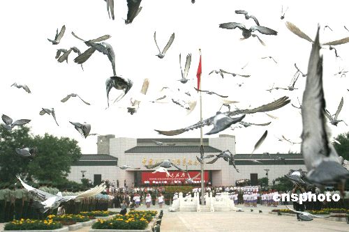 七月七日,“偉大勝利——紀(jì)念中國(guó)人民抗日戰(zhàn)爭(zhēng)暨世界反法西斯戰(zhàn)爭(zhēng)勝利六十周年大型主題展覽”在北京中國(guó)人民抗日戰(zhàn)爭(zhēng)紀(jì)念館正式開展。展覽共選用文物八百余件、照片六百余張、圖表近四十件,有大量的歷史資料、其中的一百四十一件文物為首次披露。圖為開展儀式上和平鴿飛翔。作者:盛佳鵬