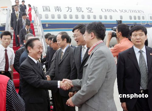 新黨主席郁慕明率領(lǐng)的臺灣新黨“民族之旅”訪問團七月八日下午抵達大連,在機場受到當?shù)嘏_商代表的熱情迎接。作者:毛建軍