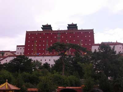 這座“小布達(dá)拉宮”始建1767年,歷經(jīng)4年竣工。它仿照了西藏布達(dá)拉宮“城”和山頂兩個(gè)部分,墻壁紅白相間,有藏式平頂?shù)锓、藏式臺(tái)塔、藏式殿堂等,但它又不僅是西藏布達(dá)拉宮的復(fù)制品,它在模仿中融合了漢族建筑傳統(tǒng),“漢藏合一式”的建筑特色在這棟占地22萬(wàn)平方米的寺廟中隨處可見(jiàn)。