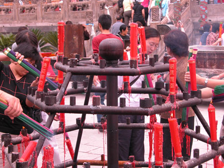 圍著香爐燃香的訪客