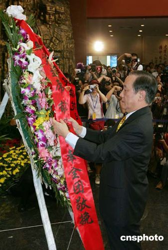 隨后郁慕明一行來(lái)到位于宛平城北側(cè)的“中國(guó)人民抗日戰(zhàn)爭(zhēng)紀(jì)念館”。在序廳里,郁慕明向抗日英烈們敬獻(xiàn)了花圈,并默哀致敬。隨后,訪問(wèn)團(tuán)參觀了“偉大勝利——紀(jì)念中國(guó)人民抗日戰(zhàn)爭(zhēng)暨世界反法西斯戰(zhàn)爭(zhēng)勝利六十周年大型主題展覽”。展覽分民族危急救亡興起、國(guó)共合作共赴國(guó)難、中流砥柱抗戰(zhàn)燈塔等八個(gè)部分。記者注意到,郁慕明在國(guó)共合作共赴國(guó)難以及臺(tái)港澳同胞抗日部分逗留時(shí)間最長(zhǎng)。