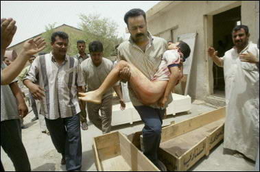 中新網(wǎng)7月14日電 據(jù)法新社報(bào)道,一名自殺式汽車(chē)爆炸襲擊者七月十三日在美軍士兵向伊拉克兒童發(fā)放巧克力時(shí)發(fā)動(dòng)了襲擊,爆炸造成二十四名伊拉克兒童喪生。圖為在巴格達(dá)一家醫(yī)院太平間外扛著兄弟尸體的伊拉克人。(春風(fēng))