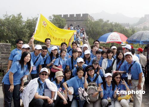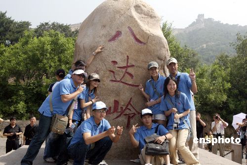 七月十四日,二○○五年臺胞青年千人夏令營營員游覽北京八達嶺長城。圖為營員們在長城上合影留念。作者:任海霞