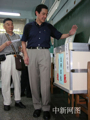 7月16日,中國國民黨主席選舉在全臺601個投票所展開。圖為1號參選人、臺北市長馬英九在居家附近的臺北興德小學參加投票,將選票投入票箱的瞬間。中新社記者 董會峰