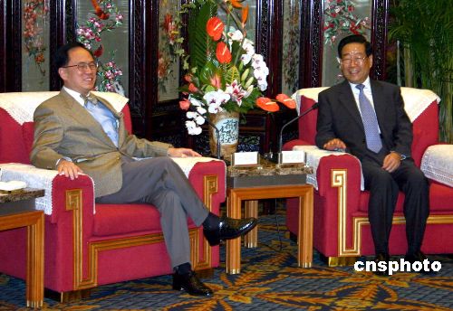 香港特首曾蔭權率領政府代表團于7月24日抵達成都,出席將于25日開幕的第二屆“泛珠三角區(qū)域合作與發(fā)展論壇”。中共四川省委書記張學忠(右)下午會見了曾蔭權一行。作者:楊杰