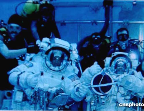 圖:美國公布發(fā)現(xiàn)號宇航員訓練太空行走的照片