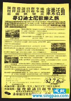 2日,記者在某商場(chǎng)內(nèi)不同角落,發(fā)現(xiàn)張貼了印有276元迪士尼“優(yōu)惠團(tuán)”的宣傳單張,由永東旅行社接待,團(tuán)費(fèi)包括來(lái)回空調(diào)車(chē)接送。