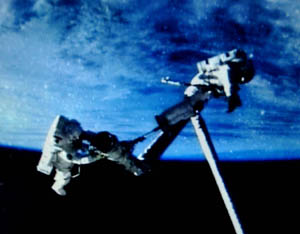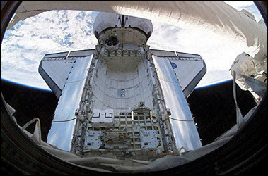 史蒂芬·羅賓遜在空間站機(jī)械臂協(xié)助下到達(dá)發(fā)現(xiàn)號前腹部,作了約五十分鐘的“太空手術(shù)”,順利清除隔熱瓷片縫隙凸起的填充材料。