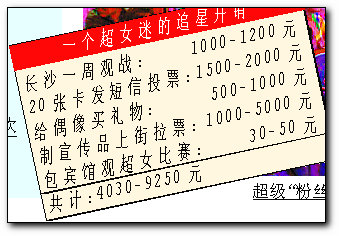 追人氣超女,究竟要花多少錢?一個令人咋舌的事實是:7月29日超女比賽前,北京超迷包機(jī)趕赴長沙,為自己的偶像助威,而這種待遇,之前只有羅大佑“享受”過。粗略估計,去一趟長沙,僅住宿和飲食,就要花去1200元,還不包括誤工費。