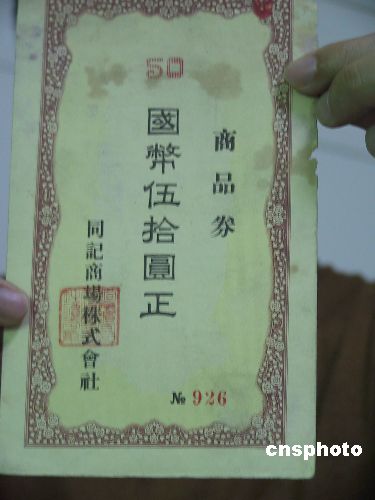 湖南省收藏協(xié)會(huì)理事闞志雄先生8月8日向記者展示了其收藏多年的“同記商場(chǎng)株式會(huì)社”商品券。該商品券反面左下角貼有一張橘紅色、面值五分的印花,上面寫(xiě)著“滿洲帝國(guó)收入印紙”。這成為當(dāng)年日本扶持偽政府、對(duì)華經(jīng)濟(jì)侵略的又一鐵證。作者:劉雙雙