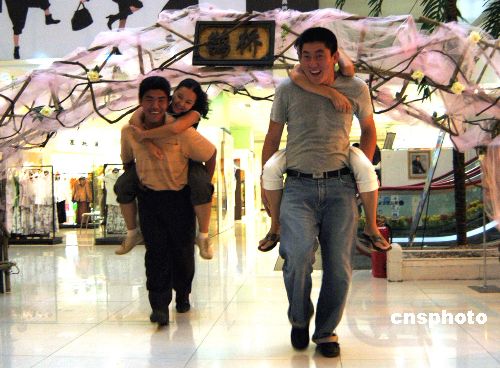 8月11日是“七七情人節(jié)”,在山東濰坊世紀(jì)泰華購(gòu)物廣場(chǎng),兩對(duì)情侶正在參加背妻比賽。近幾年來(lái),“七七情人節(jié)”受到了越來(lái)越多的年輕人的喜愛(ài)。許多商家也抓住這一商機(jī),舉辦活動(dòng)吸引人氣,進(jìn)行促銷(xiāo)。作者:王志德