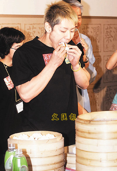 一身T恤和短褲打扮的小林尊昨午在“大食一番爭霸戰(zhàn)”決賽上,氣定神閑地上場,面對主辦方準備的叉燒包,面無懼色,不慌不忙的開始競食。只見他先將叉燒包掰成兩半,把包子在兩手中稍微捏小一點,便送入口,再喝一口水,頸一仰、頭一低,幾秒鐘內(nèi)一個叉燒包就吞入肚。
