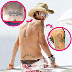 英國(guó)球星大衛(wèi)·貝克漢姆的家庭成員——6歲的布魯克林、2歲的羅密歐和5個(gè)月的克魯茲,以及妻子維多利亞——都在他身上留有永久的痕跡,不過(guò)他身上還有一些宗教色彩的文身,包括一個(gè)小天使和一個(gè)帶翅膀的十字架,據(jù)這些文身的作者說(shuō),“他把這些看做是保護(hù)孩子的守護(hù)神”。