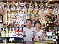 赫爾辛基“楊氏”中餐店老板楊先生與太太在自己開的吧臺前距奧林匹克體育場很近的地方有一家叫“楊氏”的酒吧兼中餐館。東主楊先生來自中國廣州市,他在這里已有15年多了。這家中餐館除了有30幾個座位外,還有一個吧臺。