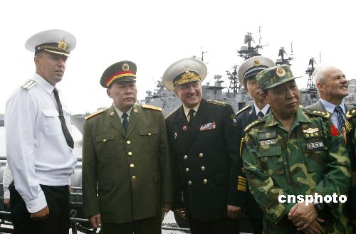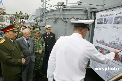 十八日傍晚,中國解放軍總參謀長梁光烈上將(左二),在俄羅斯太平洋艦隊基地參觀“瓦里亞克”巡洋艦時,聽取俄羅斯軍官介紹情況,太平洋艦隊司令費奧多羅夫海軍上將(左三)、中俄聯(lián)合軍事演習中方總指揮葛振峰上將陪同參觀。作者:王麗南